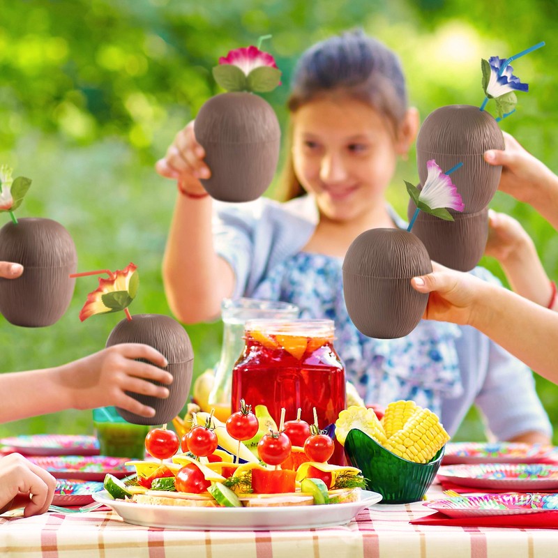 - GREAT VALUE COCONUT CUPS & HIBISCUS FLOWER STRAWS: 18 coconut-shaped cups with twist-off lids and assorted color bendable straws with a brighlty-colored tropical hibiscus flower for the perfect Luau, Hawaiian, or Beach Inspired Party.