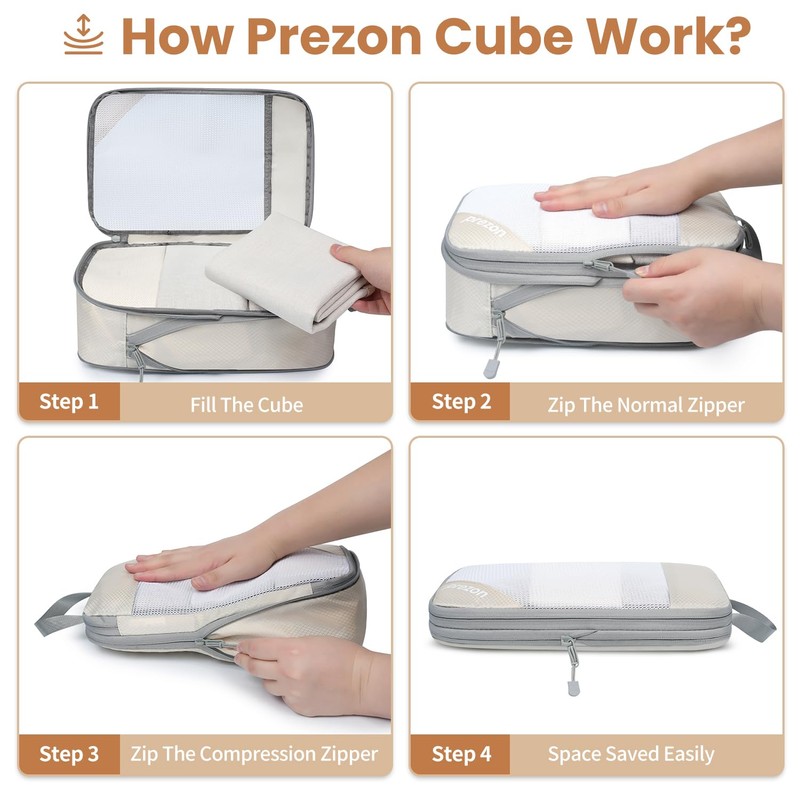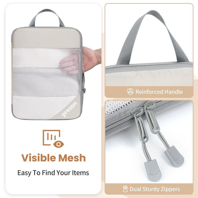 Prezon 8 Set/6 Set/4 Set Compression Packing Cubes for Travel, Lightweight Vacation Travel Essentials, Accessories for Suitcase Organizer Bags Set, Durable Luggage Organizer (6-half mesh-Beige)
