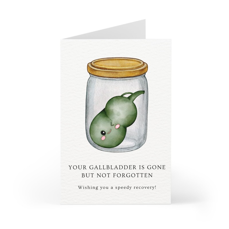 - Send a little humor and many good wishes with our gallbladder surgery card. This 5" x 7" folded card features the cheerful message "Your gallbladder is gone but not forgotten" on the front, along with a whimsical watercolor illustration of a symbolic gallbladder in a jar, because even organs deserve a proper farewell