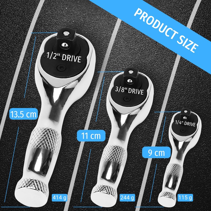 - Socket Wrench Set: 3 Piece stubby ratchet wrench set includes 1/4 inch ratchet, 3/8 inch ratchet and 1/2 inch ratchet to operate different sizes drive sockets and easy to operate for your daily work.