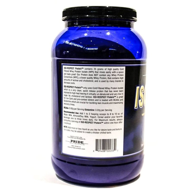 ISO-RESPECT Protein contains 25 grams of high quality Cold Filtered Whey Protein Isolate (WPI) that mixes easily with a spoon and taste great! Our Protein does NOT contain any Whey Protein Concentrate (WPC), a lower quality Whey Protein that contains high amounts of lactose and cholesterol and used by many brands to decrease costs. ISO-RESPECT Protein only uses Cold Filtered Whey Protein Isolate which is a quick release very clean protein that has never been exposed to high heat leaving it virtually un-denatured and very low in sugar, fat, cholesterol and lactose. ISO-RESPECT Protein is great for low Carb and pre-contest dieters and is loaded with BCAA's and Glutamine which are crucial for building lean muscle and maximizing recovery times. BCAA's: 5.92g per Serving (Isoleucine 1625mg, Leucine 2750mg, Valine 1550mg) Glutamine: 3.22g per Serving Recommended Use: Add 1 to 2 Scoops to 8 to 10 oz. of Water, Milk, Almond/Soy Milk, Yogurt, Cereal and/or your favorite beverage one to three times daily. For Maximum results, always consume a serving of ISO-RESPECT PROTEIN within one hour after a workout. NOTE: Add more or less liquid as you like for desire taste and texture. Ice cubes may be added to create a thicker chilled taste.