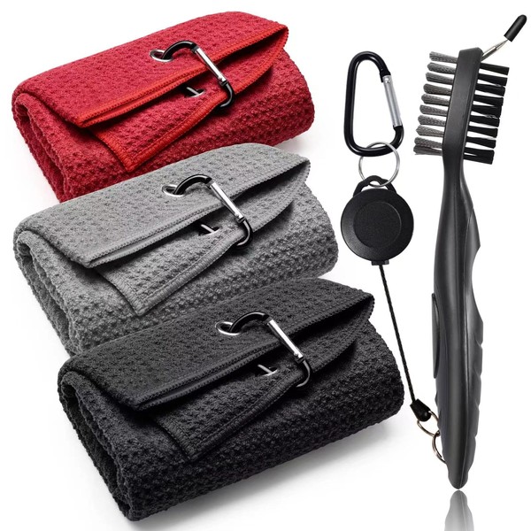 PRIDEEP Golf Towel (16"X16") and Golf Club Brush,Soft & Absorbent Microfiber Waffle Pattern Golf Towels with Carabiner Clip,for Golf Bags, Golf Club Cleaning Kit Black/Grey/Red, Men & Women Golf Gift