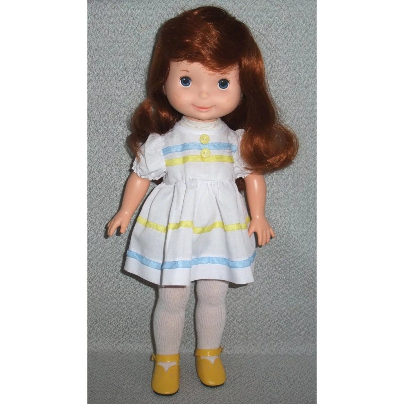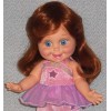 JANELLE DOLL WIG... This attractive doll wig is medium length with some wave in it. Bangs are feathered to the sides. The color is dark ginger. The wig is size 12.