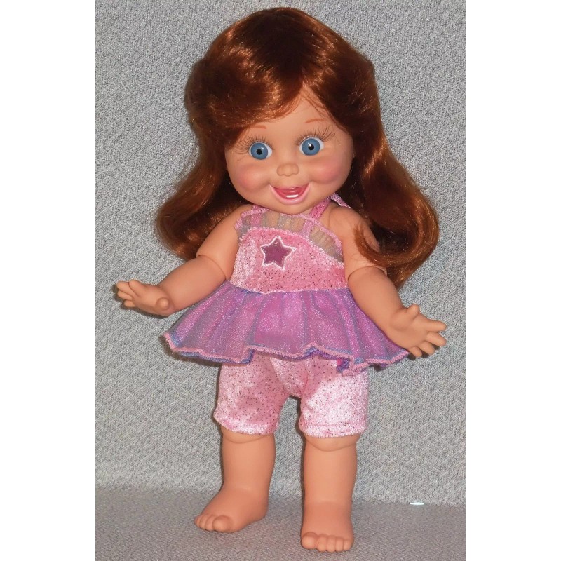 JANELLE DOLL WIG... This attractive doll wig is medium length with some wave in it. Bangs are feathered to the sides. The color is dark ginger. The wig is size 12.
