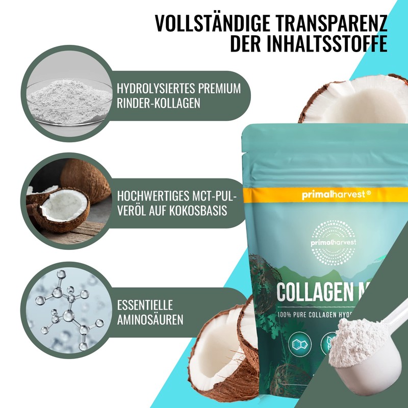 Primal Harvest® Collagen MCT powder (30 servings), bioactive premium collagen complex, sustainable grass feeding, collagen hydrolysate, coconut oil powder, neutral in taste, optimal solubility