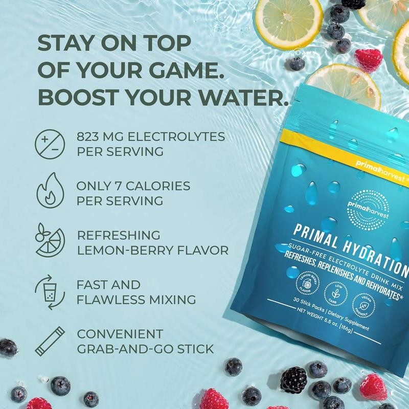 Primal Hydration Lemon-Berry Electrolyte Drink – 0g Sugar, Vitamin C, B3, B6, B12, Calcium, Magnesium, Sodium, Potassium & Coconut Water