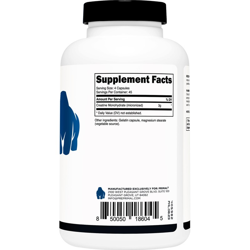 Primal Creatine Monohydrate (3,000 Mg, 180 Caps) - Micronized Creatine Supplement, 750mg Per Capsule, Great for Preworkout and Recovery - Gluten-Free, Non-GMO