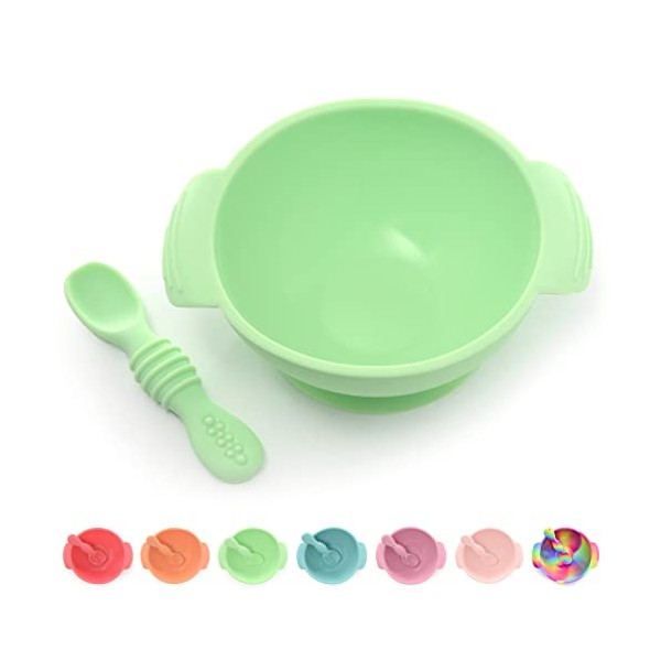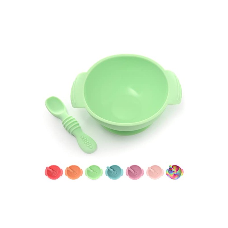 PrimaStella Unbreakable Silicone Non-Slip Bowl and Chew Spoon Set for Babies and Toddlers (Green)