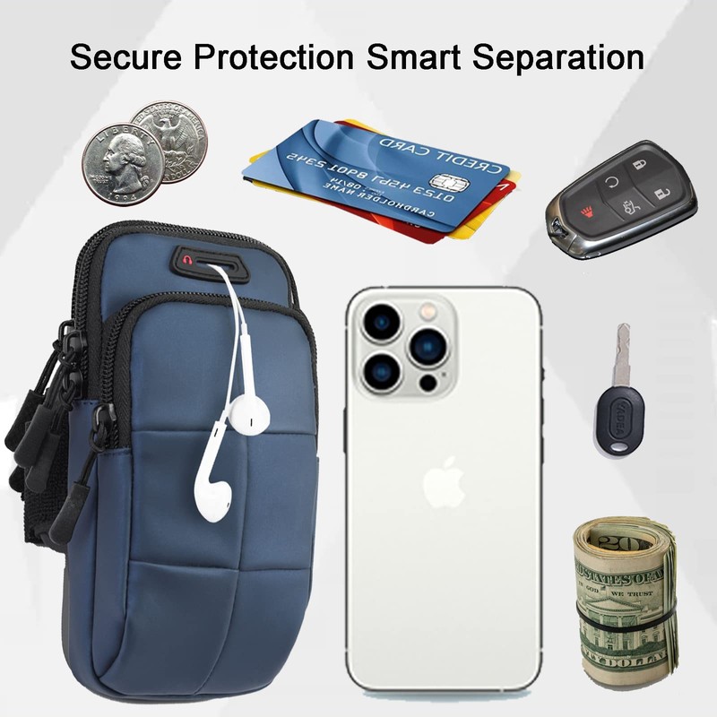 - [Secure Protection]This running armband with double deck and double zipper exercise pouch provides large and safe space for your cellphone as well as your house or car keys, ID/credit cards, cash, earphone, iPod & other accessories whilst doing outdoor activities. Never worry about losing them. Also, headphone and charger cutouts allow convenient access to the phone for hands free and listening music.