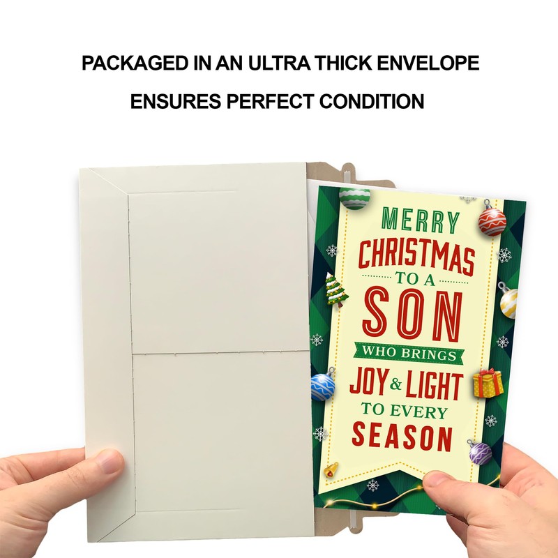 Prime Greetings Son Christmas Card, Made in America, Eco-Friendly, Thick Card Stock with Premium Envelope 5in x 7.75in, Packaged in Protective Mailer