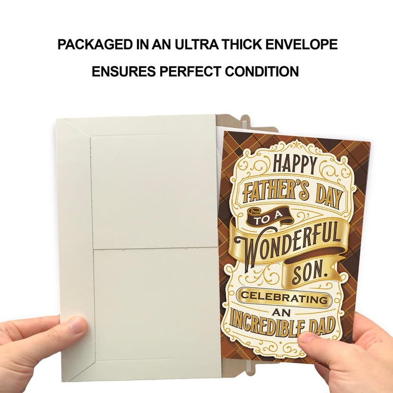 Prime Greetings Son Father's Day Card, Made in America, Thick Card Stock with Premium Envelope Packaged in a Reusable Presentation Mailer, Eco-Friendly, 5in x 7.75in