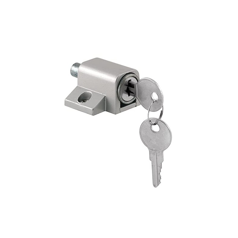 This sliding door lock is constructed from diecast and comes finished in aluminum. It features a hardened steel bolt for push button locking and only unlocks with the provided key. Helps to prevent the prying or lifting of your doors.