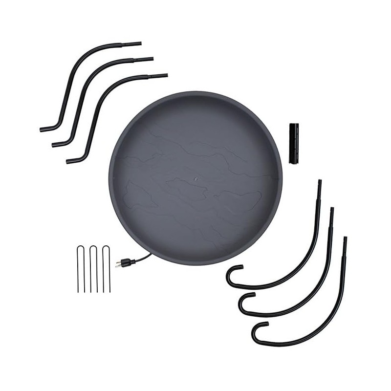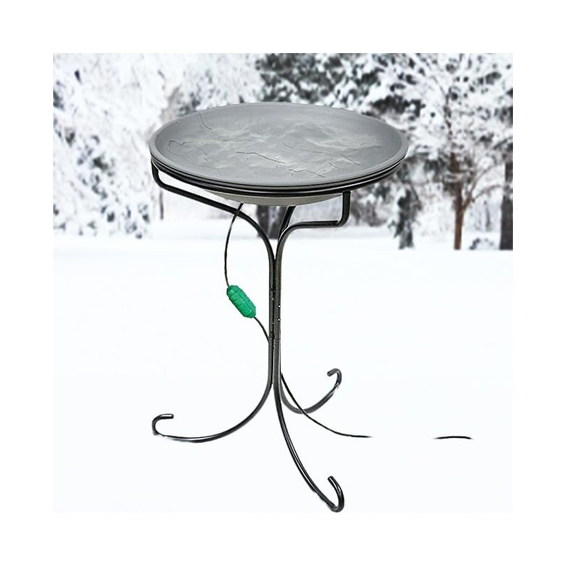Package of a Wild Bird Lover’s Slate Colored Heated Bird Bath with Metal Stand, as well as a Farm Innovators Green Watertight Cord Connector and Allied Precision Lock-N-Dry Power Supply Cord adds a focal point to your outdoor area. Situating a heated bird bath and stand in your flowerbed provides birds a bathing spot, while ensuring they have water readily available in colder conditions. This reliable, 20" diameter heated bowl features a 2" depth, providing ample space for birds to drink or preen, while the 0.25" thick rim lends an abundance of perching space. An enclosed heating element uses 150 watts of power to slightly heat the temperature of the basin, keeping water available. The basin sports a striking and recognizable slate hue, offering a natural appeal while ensuring a steady landing surface. Protect the slate bath’s plug with the included Farm Innovators Green Watertight Cord Connector to prevent snow or rain from interrupting the power supply. The included metal stand allows you to showcase this bath in your garden or flowerbed. Weather resistant seal at one end of the included, Lock-N-Dry Power Supply Cord creates a watertight connection with the plug on your bath. The cord extends to 25’, giving you plenty of versatility in placing your heated bath in your outdoor space. Assembly required. One year limited warranty on bird bath. Kit Contents: