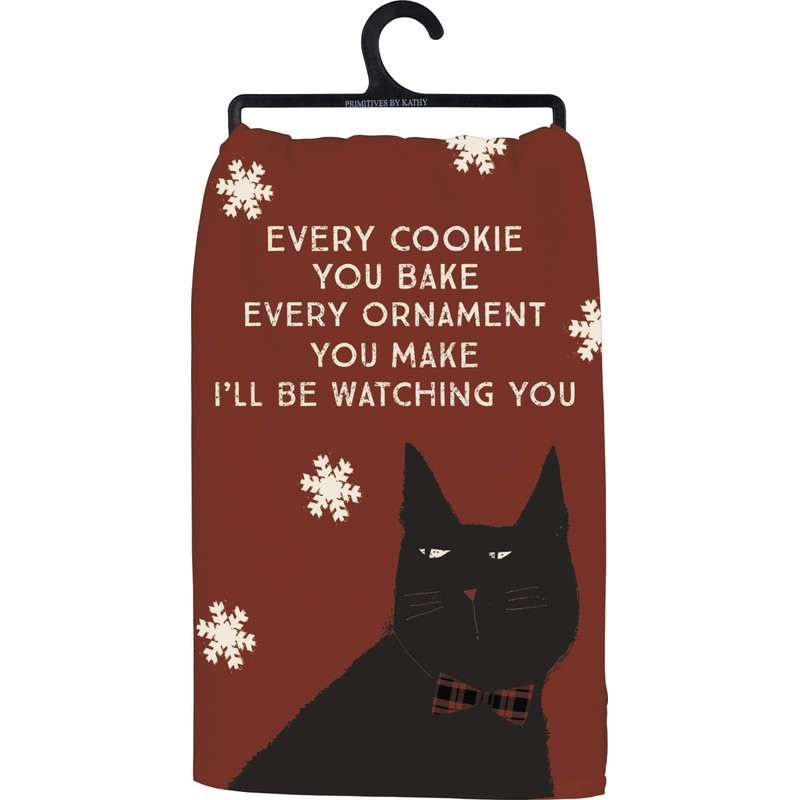 A rustic-inspired dish towel lending an "Every Cookie You Bake Every Ornament You Make I'll Be Watching You" sentiment. Features a block print cat with plaid bowtie and snowflake designs throughout.