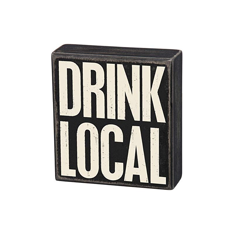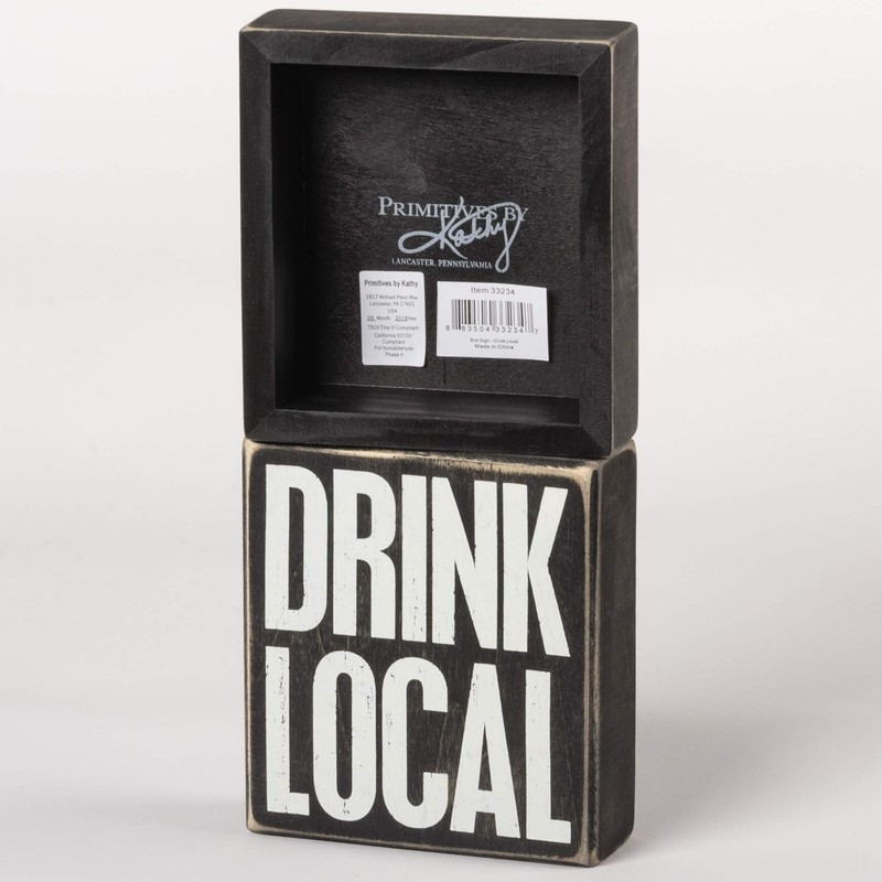 Black and white wooden box sign featuring a distressed inch Drink Local" sentiment. Measures 5 x 5.5-Inches. Easy to hang as a gallery wall accent or can free-stand alone on a shelf or mantel. stitching, and fabrics. In 1997, Kathy made her first inch primitive candle box" by hand, taking care into each detail from the sanded edges to the type of ribbon tied on the wire handles, each was a work of passion. As Primitives by Kathy grows, the company works to give back, starting with an initial relationship with goodwill services and expanding into several more charitable causes held both by the company and those the company supports on behalf of their employees. They are constantly inspired by the people, places and things around us. Kathy travels the world to pull inspiration first hand from cultures around the globe. Look for all of Primitives by Kathy for inspirational, fun, sarcastic, and heart-warming gifts and home decor. You'll want to have one for yourself and another for someone you care about.