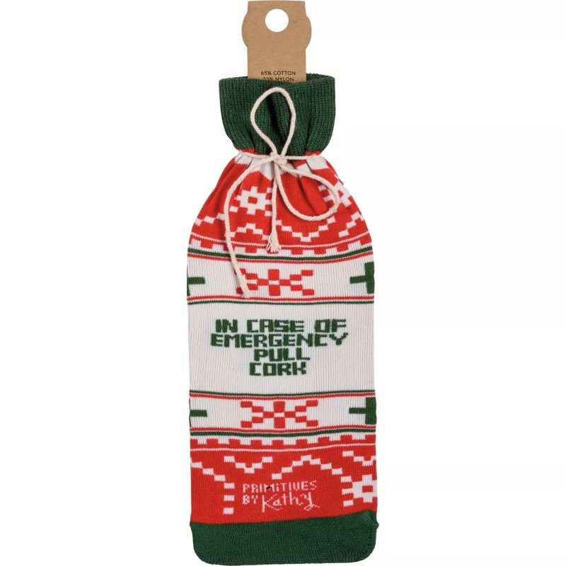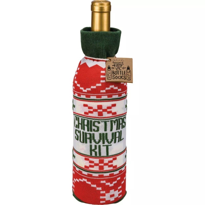 A creative alternative for a traditional gift bag, this washable and re-useable knit bottle sock features humorous "Christmas Survival Kit" and "In Case Of Emergency Pull Cork" sentiments and all-over Christmas sweater pattern. Our Christmas Survival Kit bottle sock can also be displayed on an empty bottle as a decorative accent.