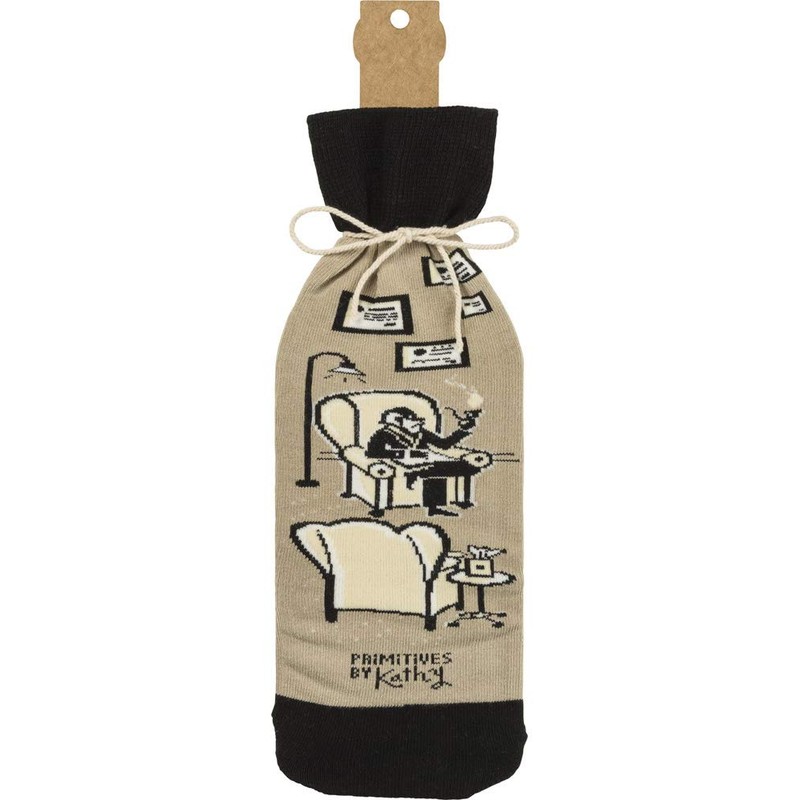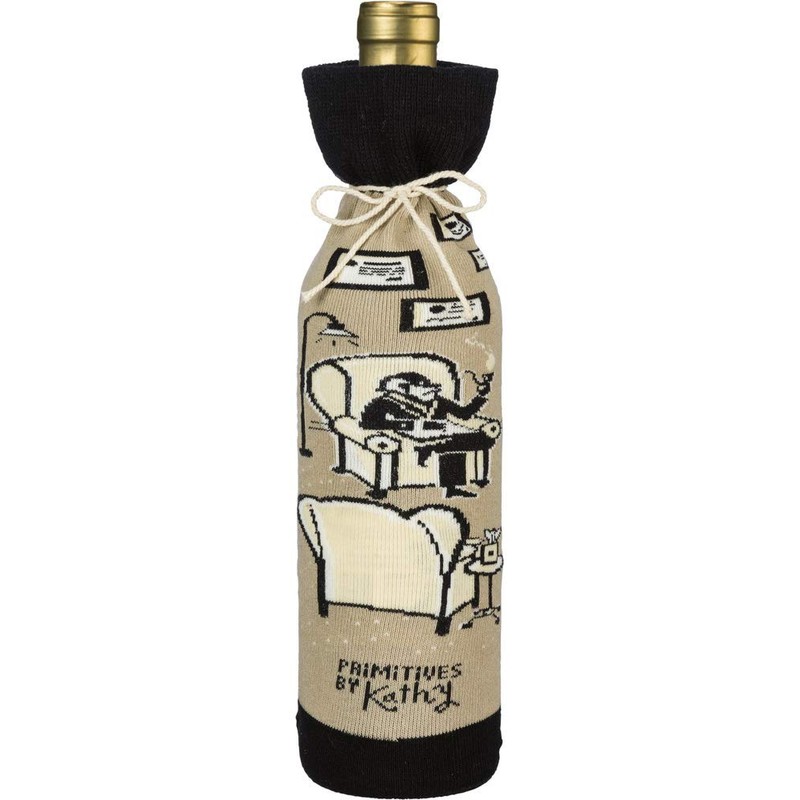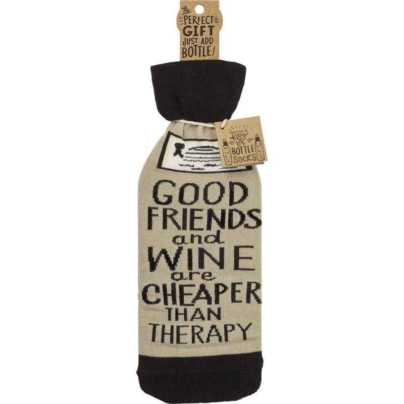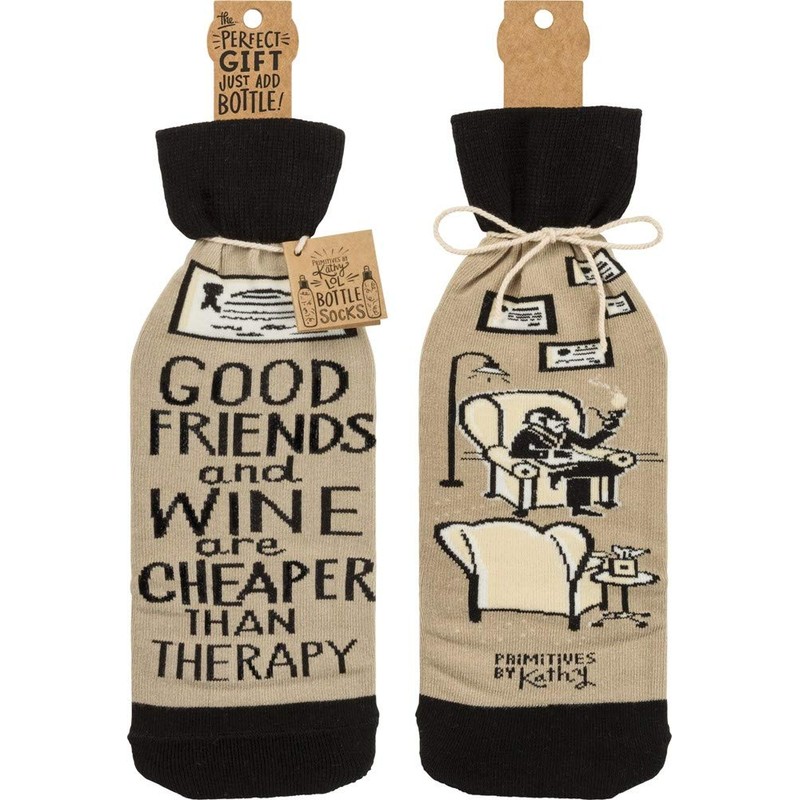 A creative alternative for a traditional gift bag, a washable and reusable "Good Friends And Wine Are Cheaper Than Therapy" knit bottle sock with character in living room designs throughout.