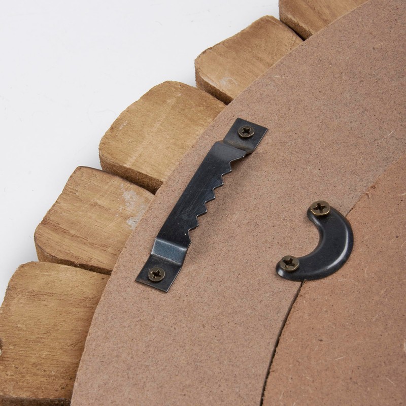 - DECORATIVE MIRROR: Round mirror with decorative border featuring pieces of wood in a driftwood style