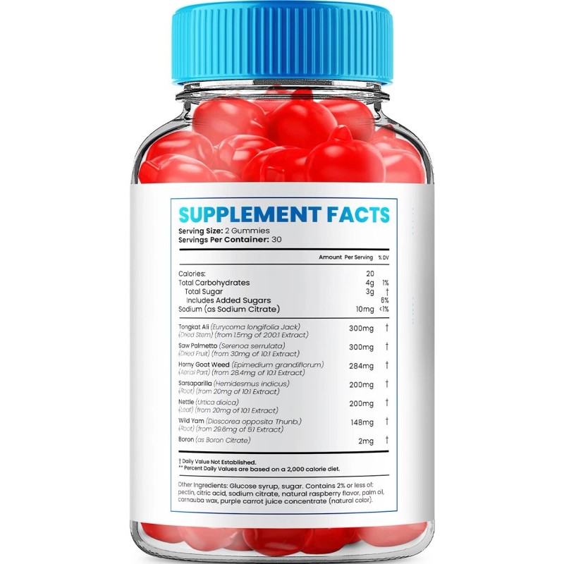 - Ingredients: Barrenwort (Epimedium), Boron, Citric Acid, Nettle (Urtica spp.), Pectin, Sarsaparilla (Smilax Ornata), Saw Palmetto, Sodium, Tongkat Ali (Eurycoma longifolia), Wild Yam (Dioscorea villosa), Glucose