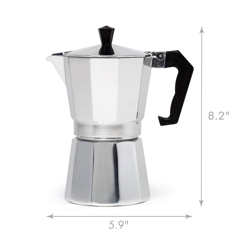Primula's Stovetop Espresso Coffee Maker delivers six perfect demitasse servings of rich, authentic espresso or Cuban coffee. Stove top expresso makers are popular because you can make quality espresso quickly, without the hassle of electric espresso machines. Primula's Stovetop Espresso Maker is compact and easy to use. Its distinctive design provides even heat distribution for enhanced flavor and aroma. Included in each box are easy step-by-step instructions to make the perfect serving of espresso the very first time. Simply fill the lower chamber with water, fill the filter with ground coffee, and place on stovetop. Within minutes, delicious, bubbling espresso will fill the pot. Remove from heat and enjoy! This cast aluminum espresso maker features a safety-release valve, a major factor in controlling the quality of your espresso. It controls the pressure with which the water is delivered to the coffee grounds. This stovetop Cuban coffee and espresso maker allows you to make delicious espresso without worry, as the safety release valve controls the pressure at a set, pre-determined level. This sturdy coffee maker is carefully crafted of strong, long-lasting cast aluminum and features a flip-top lid with a temperature resistant knob and handle that allows for easy, safe pouring.