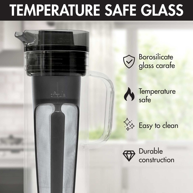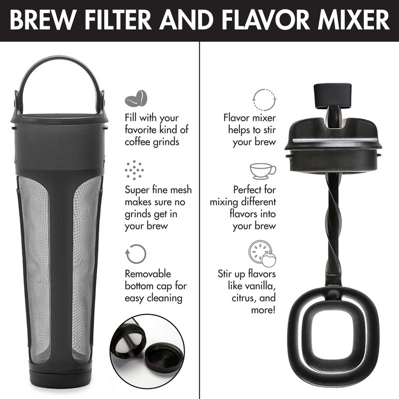 - INNOVATIVE DESIGN - Made of extra-tough borosilicate glass. Specially designed lid seals in freshness for up to two weeks and provides a smooth, drip-free pour. Fine mesh Coffee filter keeps grounds out of your coffee. Non-slip silicone base protects the glass from accidental slips. Use the included Flavor Mixer to dress up and easily mix your coffee up.