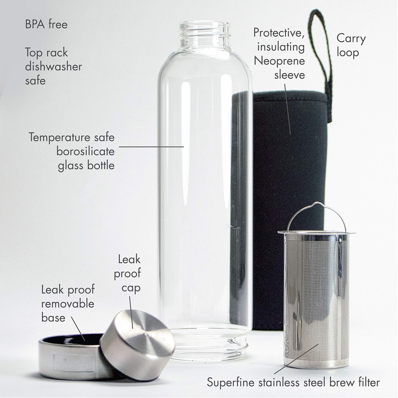 Primula Cold Brew Travel Bottle with Black Insulating Neoprene Sleeve - Borosilicate Glass and Stainless Steel Mesh Core - Dishwasher Safe - 19 Oz. - Clear
