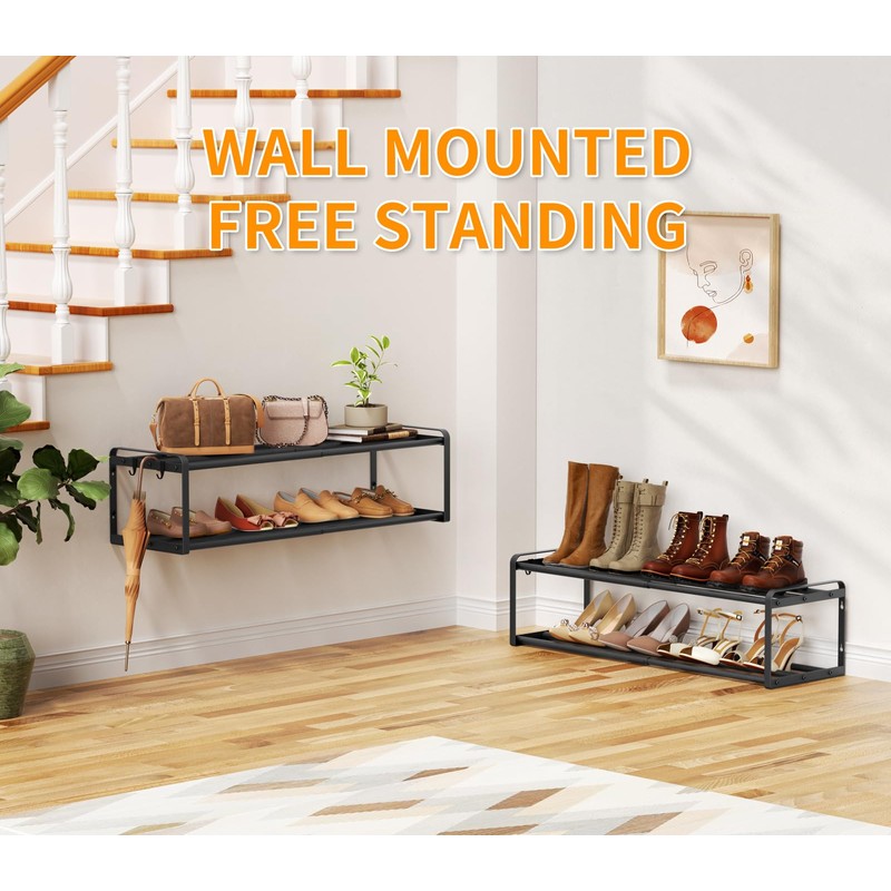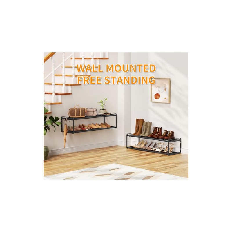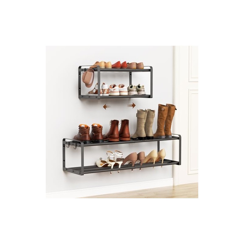- Multi-Use Wall Mounted Shoe Rack : Featuring a modern design, our hanging shoe organizer is perfect for entryways, closets, hallways, and bedrooms, offering an elegant solution for shoe storage. It can also be used as garage shoe rack to store clutter and small sports equipment, or in closets for shoes, bags and accessories. Each shoe rack comes with 2 hooks for hanging umbrella, hats, keys, and more.