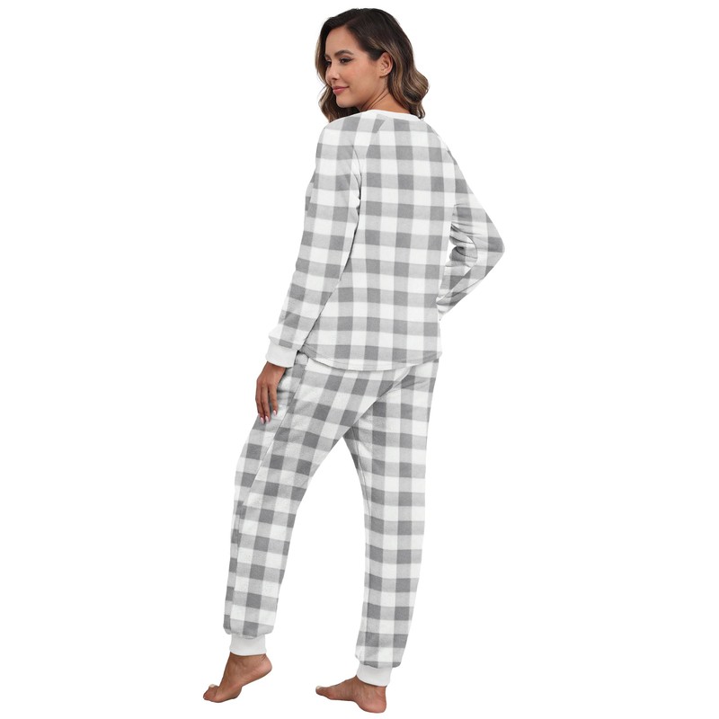 PrinStory Fluffy Pajamas for Women Soft Fleece Warm Pajama Set Fuzzy Pjs Winter 2 Piece Flannel Lounge Sets with Pockets FP-Gray Small Plaid-M