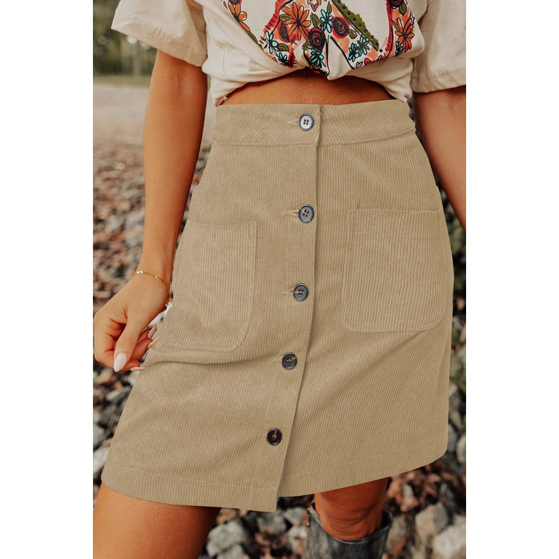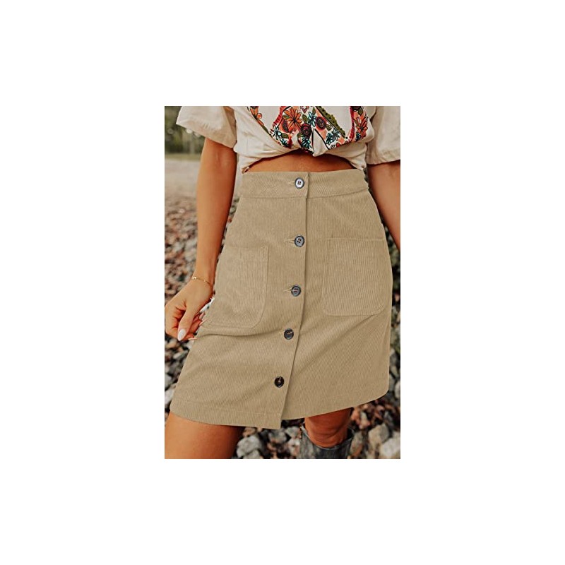 PrinStory Women's Knee Length Corduroy Skirt with Pockets, Solid Colour, High Waist, Button Front, A-line Skirts, apricot, 3XL
