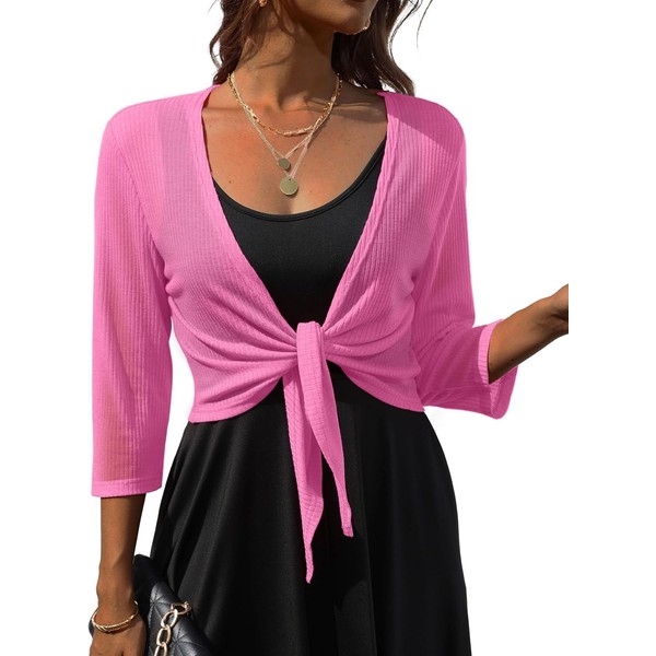 PrinStory Women's Tie Front Shrug 3/4 Sleeve Bolero Cardigan Lightweight Summer Casual Short Scarf Top, pink, M
