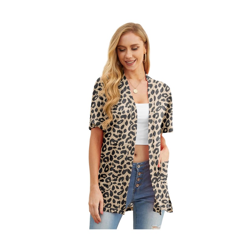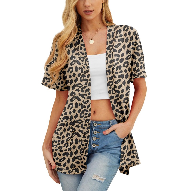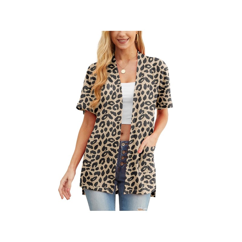 PrinStory Womens Summer Cardigan Short Sleeve Open Front Cardigans V Neck Lightweight Outerwear With Pocket Floral Print Outwear UK 10-12 (Leopard Khaki, M)