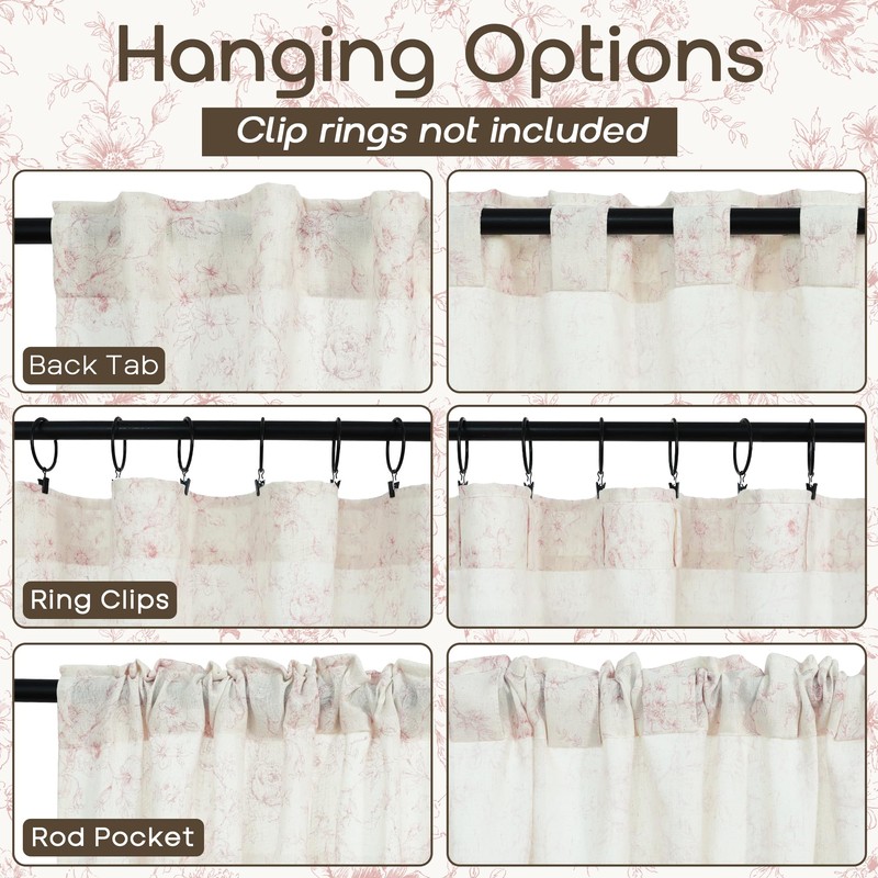 - Multi Hanging Method: Lino Rosa offer 3 hanging way for the curtains.Traditional rod pocket,viral back tab pleated,or use your own clips for a casual way.