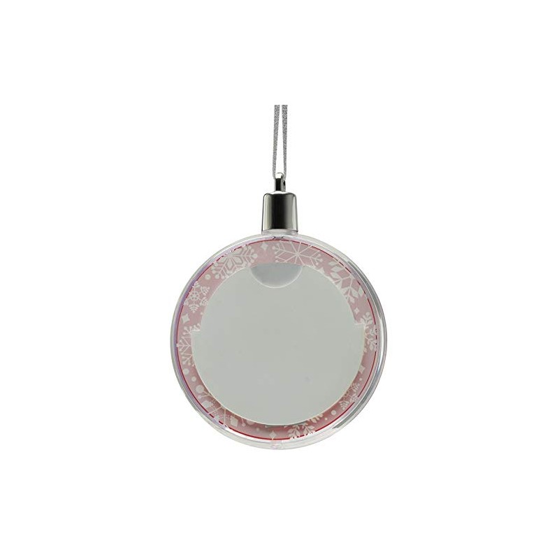 Scratch resistant clear acrylic, factory sealed with sterile water, snow and mirrored snow flake confetti with a sparkly siler ribbon. Approximately 3-1/8" in diameter and is just under 3/4" thick. Your personalized cartoon measures approximately 2.25" in the center, surrounded by a red and white snow flake border.