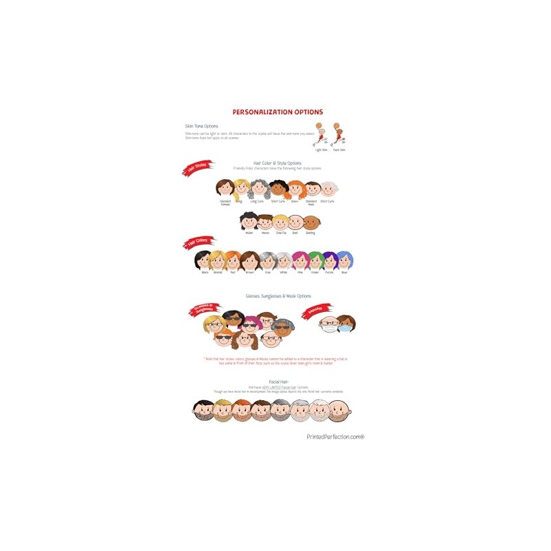 Select from light or dark skin tone. Add any name or text that you would like. It is necessary that you specify all text that you would like on the cartoon scene. Most adult characters can have a hair color or style added if you would like. Pets can also be added.