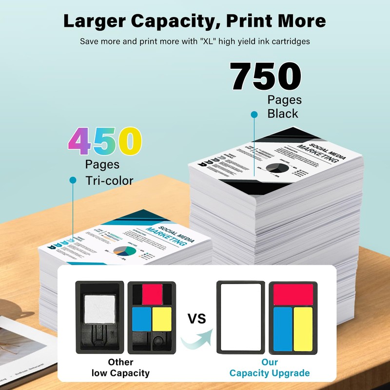 Amazing print capacity, long-lasting durability: Say goodbye to the hassle of replacing ink cartridges too often! Each Aimery 67XL black ink cartridge prints up to 750 pages, and each 67XL color ink cartridge prints up to 450 pages. The dual-package combination allows you to print for longer periods of time, whether it's a homework assignment, a work document, or a color photo.
