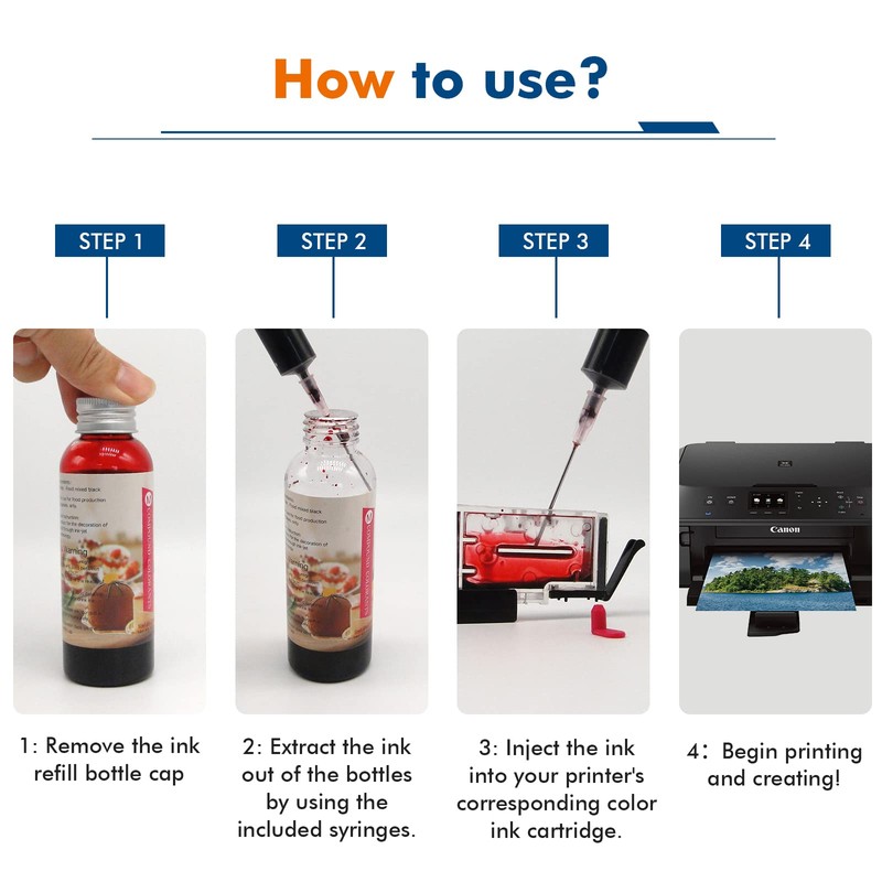 - EASY INSTALLATION: Simple 4-step process - remove bottle cap, extract ink with syringe, inject into cartridge, and start printing
