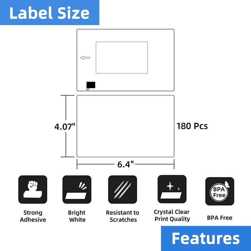 - Label Specification: Size: 4.07” x 6.4” (103mm x 164mm), 180 Labels/Roll, Replacement for Brother DK-1247 Die-Cut Large Shipping Labels + 1 Refillable Cartridge Frame.