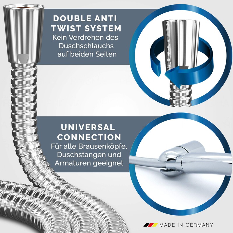 - Made in Germany – real stainless steel instead of brass in chrome-plated stainless steel look. This hose uses the elaborate double winding process. The stainless steel elements are not only simply wrapped on top of each other, but also wrapped inside each other, which makes the stainless steel hose particularly tensile resistant. The rotary cones are leak-proof attached to the shower hose with their own high-tech injection process.
