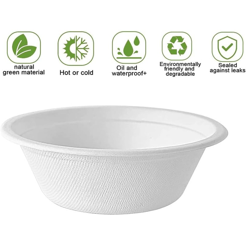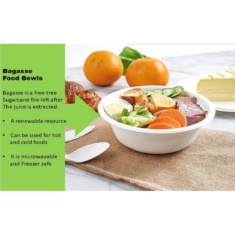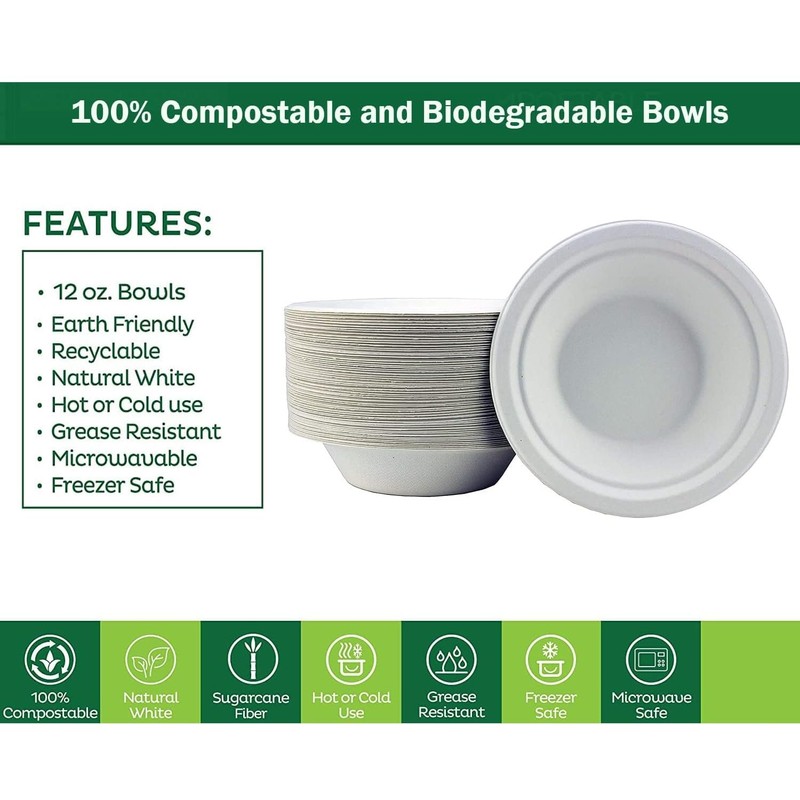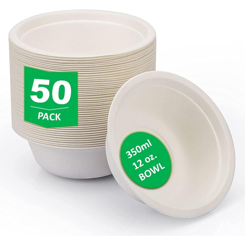- \*/ PACK OF 50, STRONG DISPOSABLE BOWLS 12oz/340ml: Made from high density Bagasse sugar cane pulp Bowls are super rigid do not not fall apart Crumble or Dissolve when USED with Liquids & Hot foods ==> PACK OF 50 BOWLS, SIZE: 12oz / 340ml ==> Ideal for SOUP, SALAD, DESSERTS, CAKE, SNACKS, Birthday Party, Christmas Party, Business Events, Home, Office, School, Picnic BBQ Party, Large Gatherings, Household Parties ==> Perfect for Serving Soup, Ice cream, Salads and much more ==> They are Sturdy and Leak Proof ==> Bowls can be Microwaved and also can be Used for both Hot & Cold foods