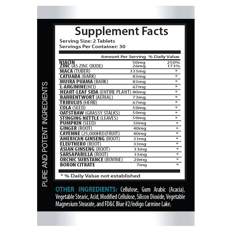 - Active Ingredients: Tribulus Terrestris, Maca, Ginseng, Tongkat Ali, Maca, 5-HTP, Alpha-Linolenic Acid, Horny Goat Weed, Epimedium Grandiforum, Tongkat Ali Root, Eurycoma Longifolia, Saw Palmetto, Wild Yam Root