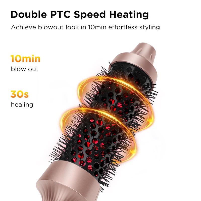 - Estilo más rápido con calentadores PTC dobles + barril de cerámica: diseñado con elementos de calentamiento PTC duales, el cepillo de rizado se calienta rápida y uniformemente para obtener resultados consistentes. El barril recubierto de cerámica garantiza un deslizamiento suave, evita enganches y reduce el daño por calor, cortando el tiempo de peinado en un 50% en comparación con las herramientas calientes convencionales