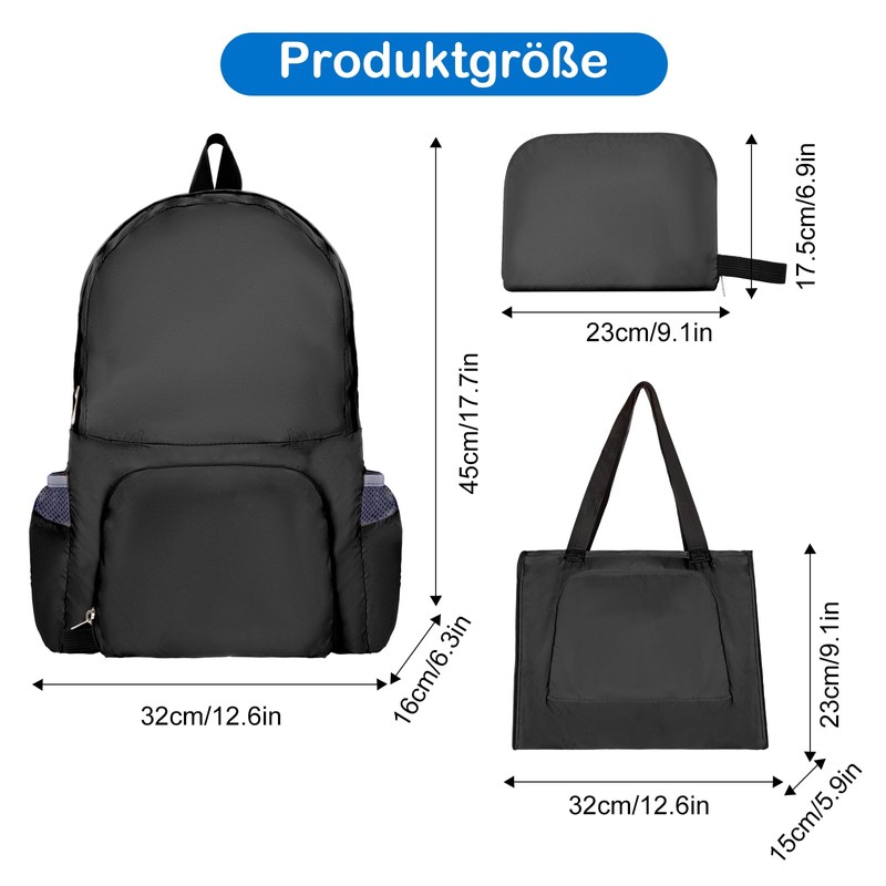 - Three deformable shapes for different needs: This small hiking backpack with 25 litre capacity is cleverly designed and can be freely deformed as needed. The backpack is easy to fold and can be used either as a school bag or as a handbag. The backpack folds easily when not needed. It is foldable ultra-light, has only the size of a mobile phone and is convenient to store, so it meets the requirements of different scenarios anytime and anywhere.