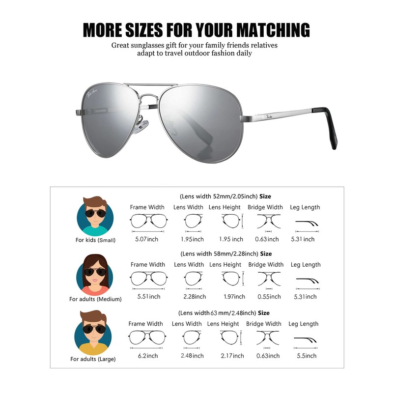 - AVIATOR PACKAGE & SIZE– This aviator sunglasses are available in three sizes: 52MM-58MM-63MM, basically suitable for everyone.. Comes with Gift Box, Microfiber Pouch, Microfiber Cleansing Cloth, User Manual and Tag.