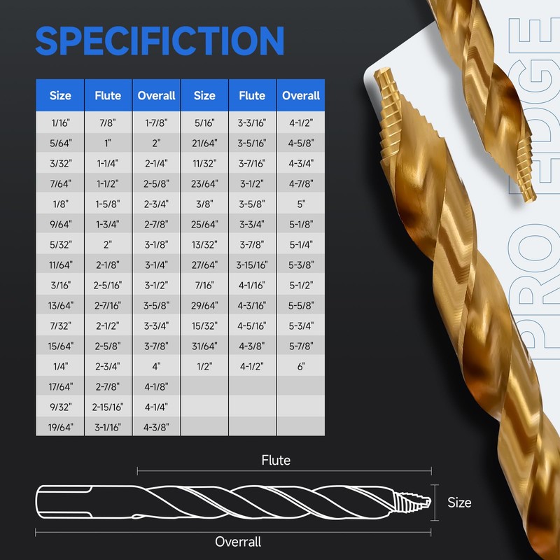 - 【Essential Sizes】This jobber drill bit set Includes 29 Commonly-used sizes on the market:1/16", 5/64", 3/32", 7/64", 1/8", 9/64", 5/32", 11/64", 3/16", 13/64", 7/32", 15/64", 1/4", 17/64", 9/32", 19/64", 5/16", 21/64", 11/32", 23/64“, 3/8", 25/64", 13/32", 27/64", 7/16, 29/64, 15/32", 31/64", 1/2". Sufficient to handle the vast majority of usage scenarios