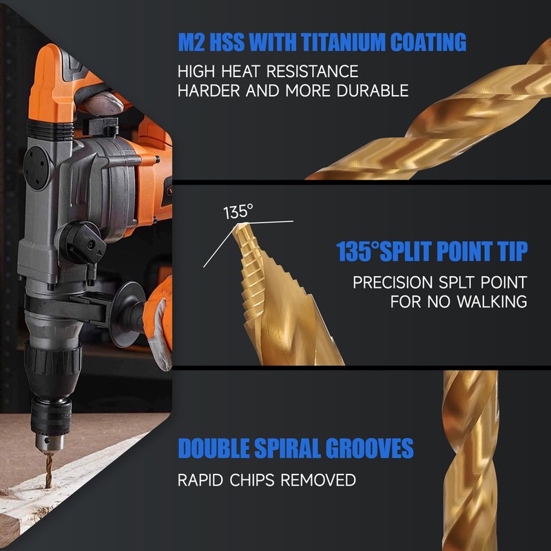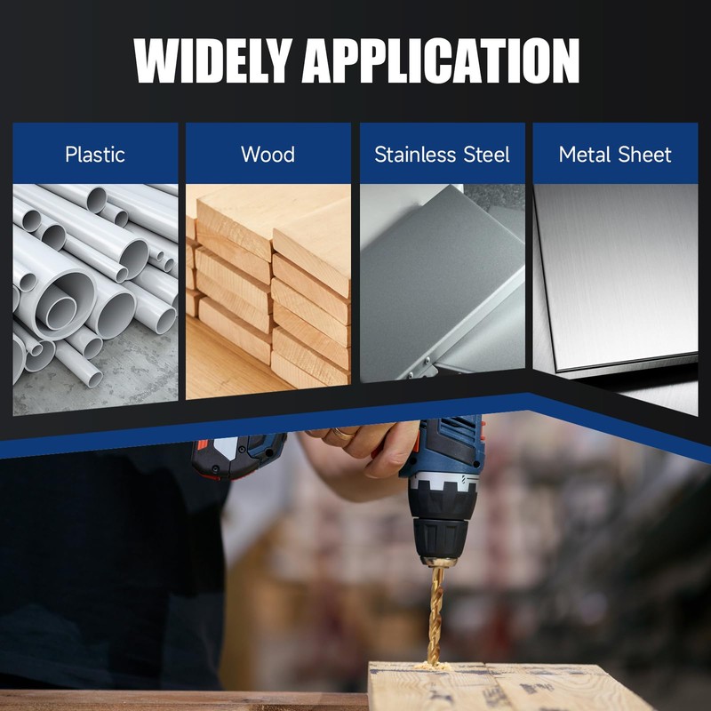 - 【Stepped Point Tip Design】The stepped point tip disperses cutting force, reduces instantaneous impact, and minimizes wear and damage to materials. It also provides centering functionality, allowing drilling without the need for a pilot hole, which enhances drilling precision and work efficiency