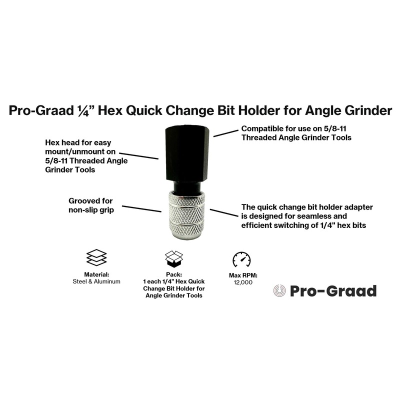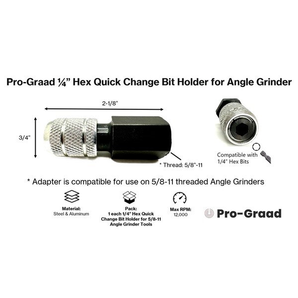 • [IN THE BOX]: 1 each Pro-Graad 1/4” Hex Shank Converter, Quick Change Bit Holder Adapter for 5/8-11 Angle Grinders