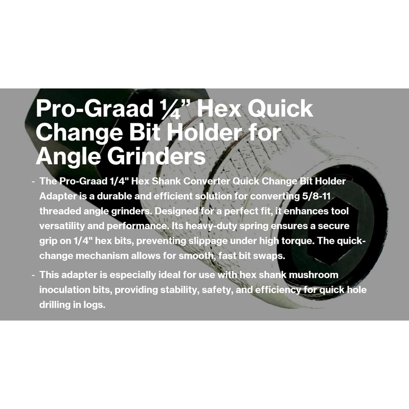 The Pro-Graad 1/4” Hex Shank Converter Quick Change Bit Holder Adapter is a game-changing accessory for mushroom log inoculation, designed to significantly enhance speed and efficiency. By converting any 5/8-11 threaded angle grinder into a powerful hex driver drill, this adapter allows seamless use of any 1/4” hex shank bits, drastically cutting down time and effort. Its quick-change mechanism ensures fast and secure bit swaps, minimizing downtime during inoculation work. Built for heavy-duty use, the adapter features a high-quality spring that maintains optimal bit tension, preventing slippage or accidental dislodging, even under high torque. This results in a smoother, faster process, ideal for high-volume projects. The Pro-Graad adapter stands out for its durability, precise fit, and ability to repurpose your existing angle grinder into a versatile hex drive tool, eliminating the need for a separate drill. Compact and efficient, it’s a must-have to boost productivity.