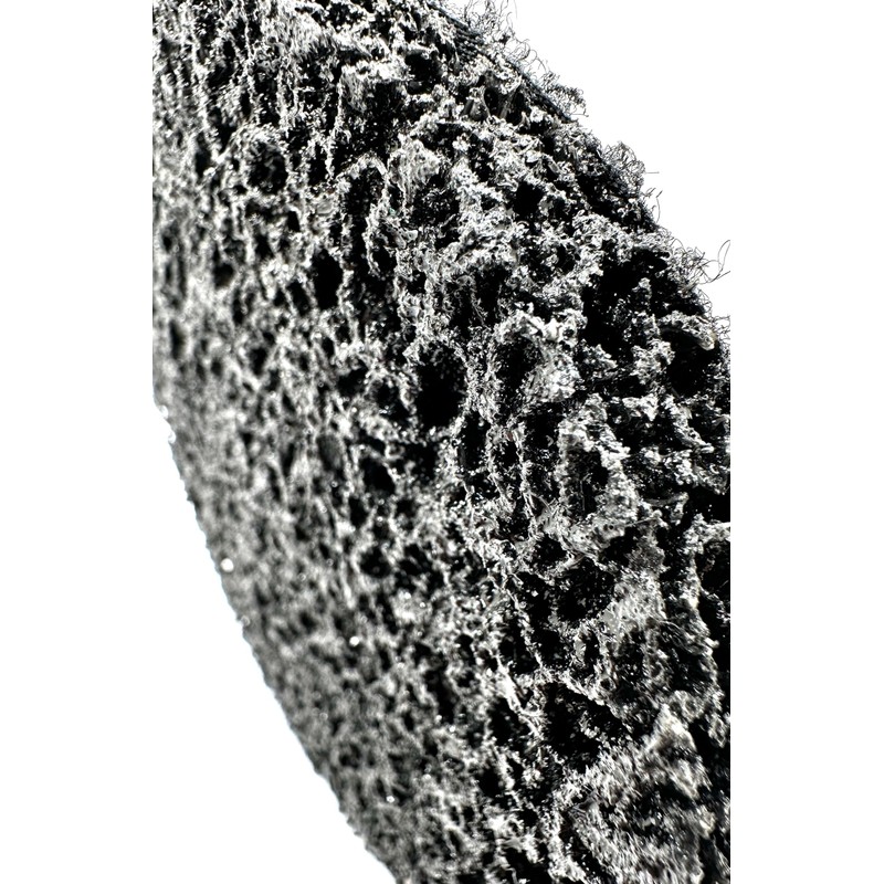 The Pro-Graad Hook & Loop Coating Removal Strip & Clean Disc is a specialized abrasive tool designed to efficiently remove paint and rust from metal surfaces and welds. It employs extra coarse (XCS) silicon carbide mineral, known for its sharpness and effectiveness in low-pressure applications, such as paint preparation. This abrasive mineral, despite its quicker breakdown compared to aluminum oxide, results in a brighter finish. The extra coarse nature of the mineral makes it exceptionally aggressive, allowing it to peel back unwanted layers without damaging the base material. What sets this disc apart is its open web structure made of conformable, non-woven material. This unique design is springy and responsive, making it ideal for applications that involve surface irregularities and contours. It excels in coating removal because it preserves the part's geometry during the process, ensuring a gentle and precise surface preparation. Furthermore, Pro-Graad Coating Removal Discs feature a Hook and Loop backing for quick and secure tool attachment, enhancing productivity during multi-step finishing processes. This attachment system simplifies disc changes, reducing downtime. This open web structure effectively removes burrs, soils, and contaminants while maintaining the workpiece's geometry. It resists loading, runs cool, and offers prolonged operation. The open web design prevents debris from clogging the mineral, ensuring consistent results and a long service life. Pro-Graad Coating Removal Discs are a versatile tool for efficiently stripping coatings, cleaning welds, and maintaining workpiece geometry. Its unique construction, abrasive material, and Hook and Loop attachment system make it a valuable addition to any workshop, enhancing productivity and ensuring high-quality surface preparation.