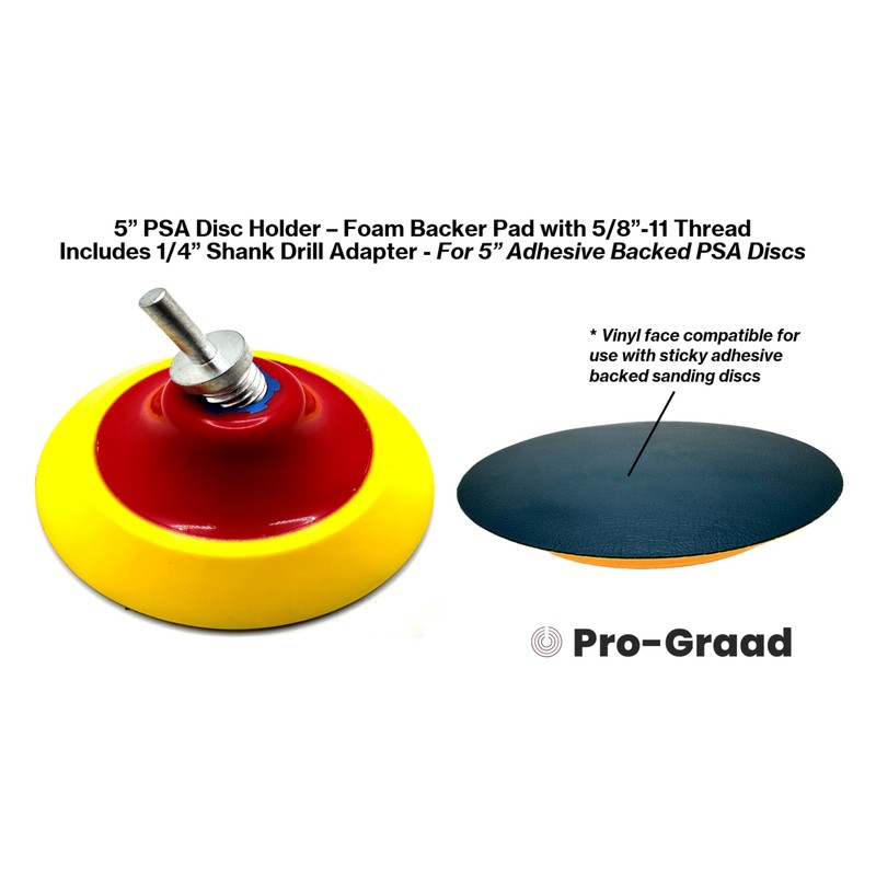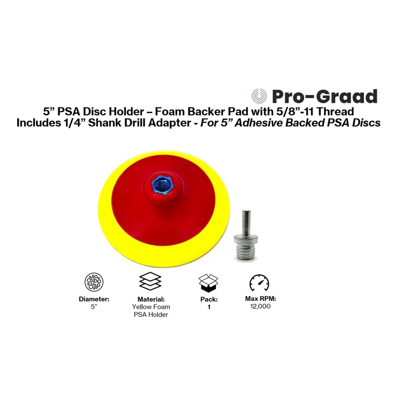 • [IN THE BOX]: 1 each Pro-Graad 5” x 5/8”-11 PSA Disc Pad Holder, 1 each 1/4" shank Drill Adapter. NOTE: This disc pad holder is compatible for use only with 5” STICKY ADHESIVE BACKED PSA DISCS.