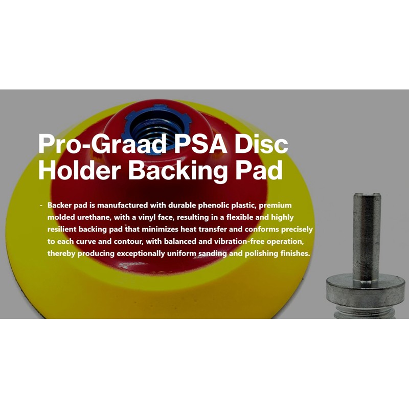 The Pro-Graad PSA Disc Pad Holder is a versatile and durable tool designed for professional sanding and polishing tasks. Its medium-density foam backing provides a firm yet flexible surface, ensuring precision and consistency in sanding applications. The holder’s flat vinyl face is engineered to securely attach pressure-sensitive adhesive (PSA) discs, allowing operators to quickly and easily switch discs without leaving residue behind. This pad holder is compatible with 5/8"-11 threaded tools, making it adaptable for use with a wide range of angle grinders and rotary sanders. Its tapered 45° edge allows for smooth sanding on both flat and contoured surfaces, offering superior performance in a variety of applications. Built to withstand speeds of up to 12,000 RPM, the pad holder supports efficient sanding, grinding, and polishing. The Pro-Graad disc holder features a slightly smaller diameter than standard 8” PSA discs, ensuring easy alignment and quick disc removal. It is compatible with popular brands like 3M Stikit and other PSA abrasive discs, making it a highly versatile tool for professionals and DIY enthusiasts alike. Its robust construction delivers reliable performance while transmitting consistent pressure directly to the work surface for optimal results. Whether tackling heavy-duty grinding or delicate polishing jobs, the Pro-Graad 5” PSA Disc Pad Holder is an essential accessory for achieving smooth, high-quality finishes on a variety of materials. NOTE: This disc pad holder is compatible for use only with STICKY ADHESIVE BACKED PSA DISCS.